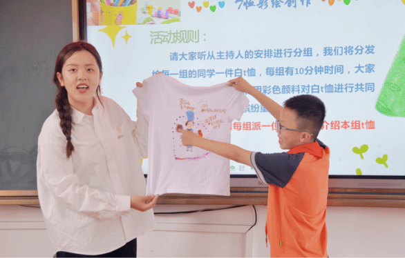 活动分三环节。首先,孩子们伴随着音乐有序入场,在主持人的带领下,完成节奏小游戏,感受情绪在音乐中的起伏;其次,通过观看缤纷的童年视频,鼓励孩子们踊跃表达他们眼中的童年梦想;最后,让孩子们在对T恤进行彩绘的过程中,激发孩子们的想象力,引导他们团结协作并用手中的画笔创造出自己心中的童年画卷。