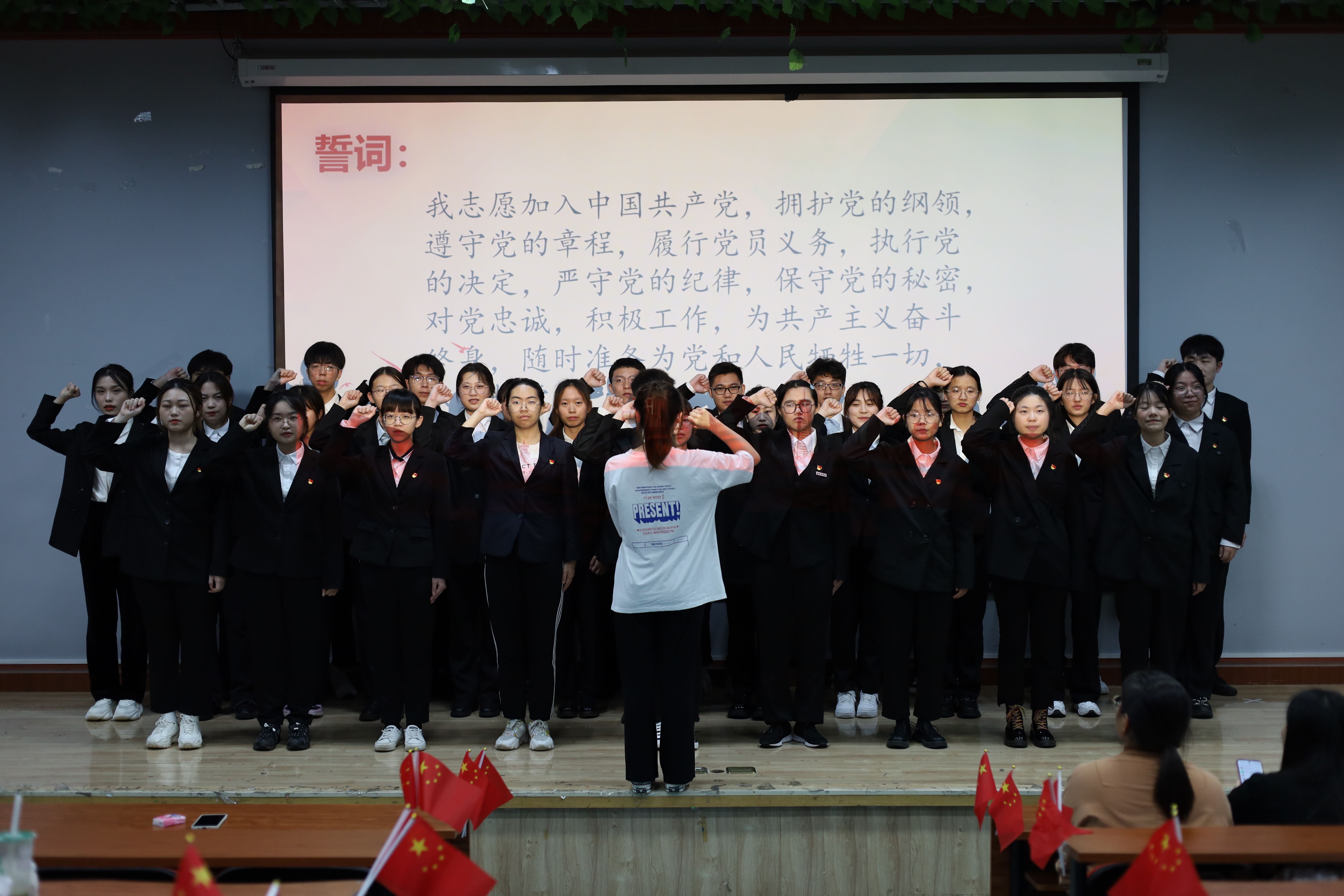 活动在慷慨激昂的《国际歌》中拉开帷幕,以微党课《深刻理解“坚持胸怀天下”的内涵要义》传递时代的召唤,传达青春的使命。正式党员陈婧同志带领预备党员面向鲜红的党旗庄严宣誓,铮铮誓言展现了在场预备党员为共产主义奋斗终身的决心和信念。支部为党员分发政治生日卡,体现了党支部对新吸收的预备党员的衷心祝福、殷切希望,激励大家更好地学党史、感党恩、听党话、跟党走,奋发有为。最后,学生第一支部书记郑亚梅老师发表致辞,她强调党员同志们要坚持胸怀天下,将党和国家的前途命运和个人紧密相连,在为党和人民事业不断作出贡献的同时书写好自己的青春篇章。