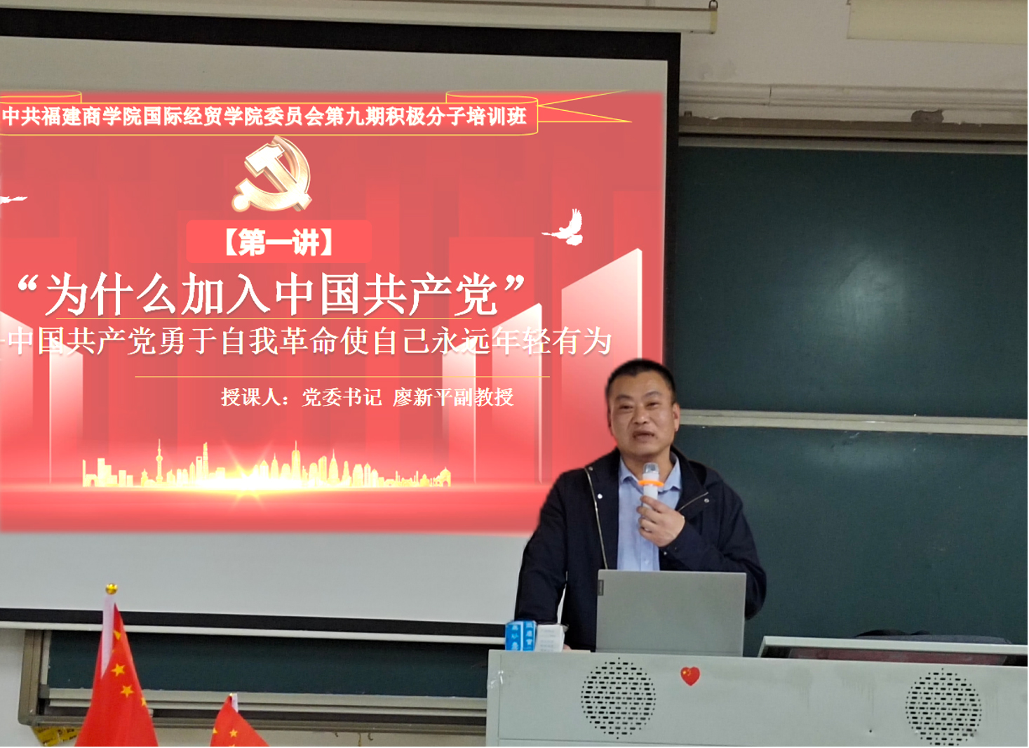 4月18日,BB贝博艾弗森官方网站第九期入党积极分子培训班举办第一堂讲座。学院党委书记廖新平为全体学员讲授“为什么加入中国共产党——中国共产党勇于自我革命使自己永远年轻有为”专题党课。