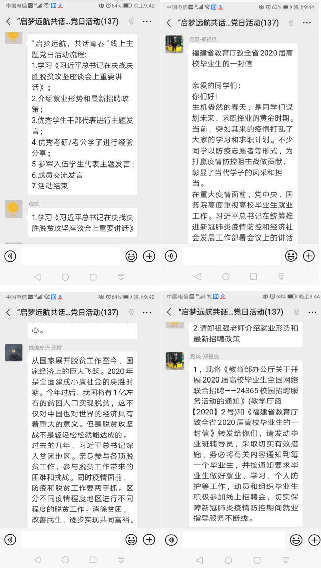 在支部微信群组织全体党员、入党积极分子、推优分子等共计137人参加“启梦远航,共话青春”主题党日活动。活动学习传达了《习近平总书记在决战决胜脱贫攻坚座谈会上重要讲话》精神,让辅导员、学生进一步掌握脱贫攻坚的相关知识,了解疫情防控时期就业形式和最新招聘政策,帮助同学们科学合理制定未来规划,明确目标,找准定位,提高青年学子的政治敏感度,把握