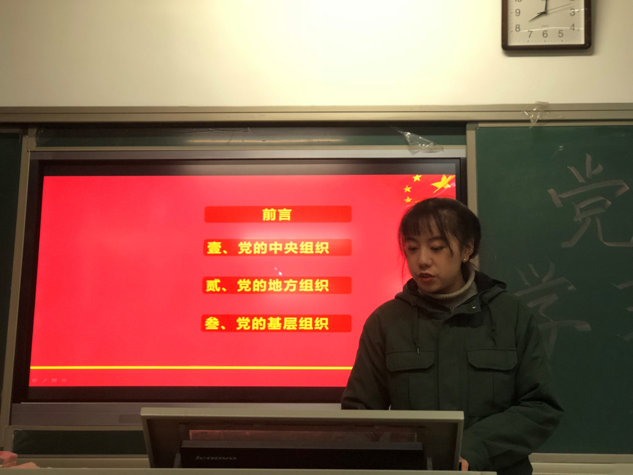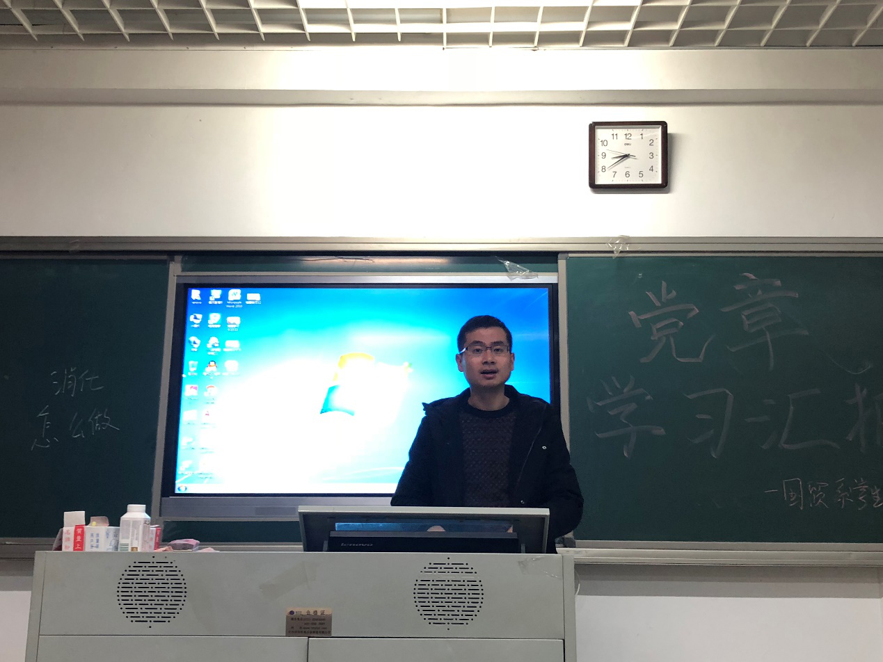为深入学习中国共产党章程,将党章“内化于心,外化于行”,把握正确的政治方向,加强党性修养,提升对党的认知,1月3日晚七点国际经济与贸易系学生党支部副书记蔡斌于笃行101开展学习新党章的汇报活动,我系18名本科班积极分子参与此次活动。