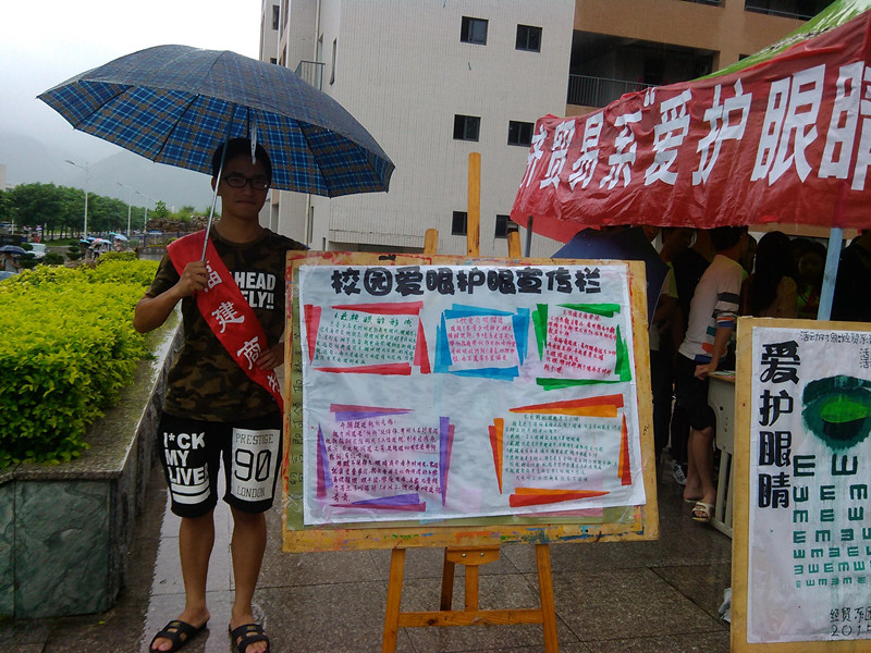 为了促进同学们对眼睛有关知识的了解,增强对用眼习惯的重视,已达到保护自己眼睛的目的,经济贸易系青年志愿者服务队于2015年6月5日在学校食堂门口举办了“爱护眼睛,守住光明”的活动。