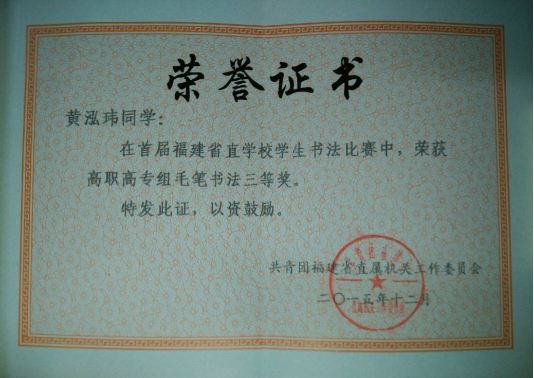 我系15金融保险专业的黄泓伟同学代表学校参加高职高专组毛笔书法比赛。作品没有华丽的装裱,却在简单中凸显优秀。经过一番激烈的角逐,我系学子黄泓伟同学勇夺高职高专毛笔组三等奖。台上一分钟,台下十年功。没有谁的成功是一蹴而就的,没有好几年扎实的功底,是无法在众多优秀作品中脱颖而出的。在此热烈祝贺我系黄泓伟同学取得优异成绩。