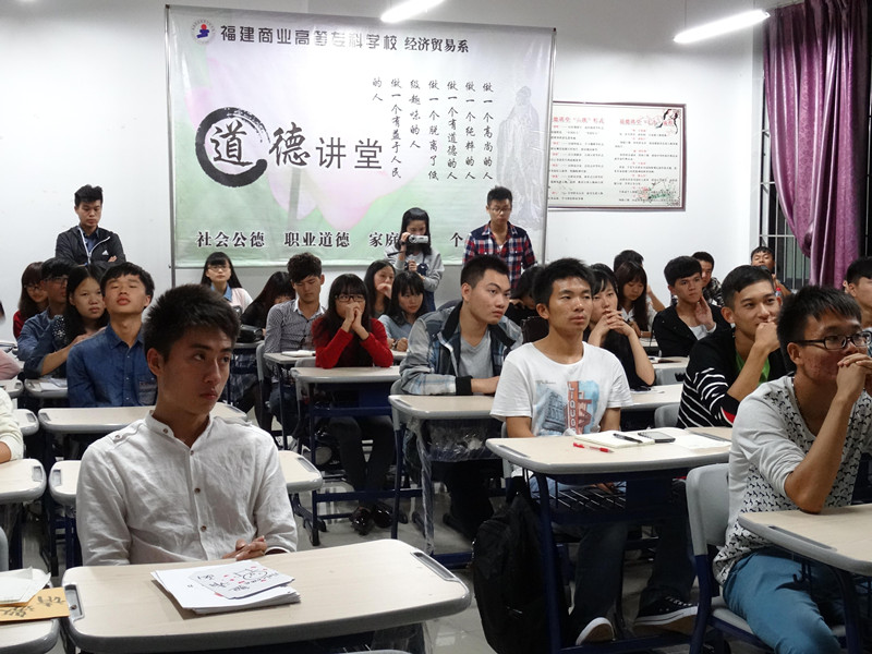 迎着星光,踏着月色。瞻仰圣贤,聆听经典。2014年10月19日晚,由经贸系团宣部主办的主题为“中华梦、教育梦、福商梦”之学《大学》道德讲堂活动在我校潘渡校区教学楼108教室展开,参加本次讲堂的同学已早早来到了教室,怀着虔诚怀着学习的。出席本次活动嘉宾有校团委宣传部谢宇涵同学。