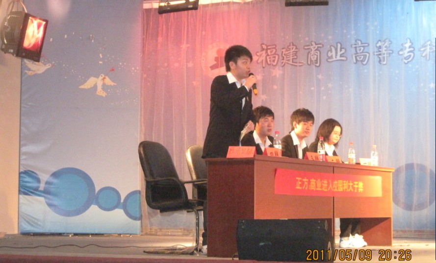 2011年5月9日18:30,福建商专纪念中共建党九十周年之福建商专第十五届“挑战杯”辩论赛复赛,在校学生活动中心隆重举行。