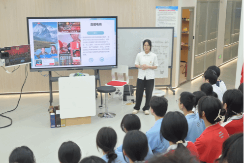 首先,2022级电子商务专业的叶佳莉同学化身“小老师”,以“直播带货助脱贫”的真实案例视频为引,带大家深入了解直播行业背后的社会价值与经济动能。她从直播室搭建的基础要素讲起,通过展示BB贝博艾弗森学生在直播实践中的精彩视频,生动呈现了电商直播的全流程运作。这堂兼具理论深度与实践温度的认知课,不仅为中学生们揭开了电商直播的神秘面纱,更在他们心中播撒下了创新商业思维的种子。