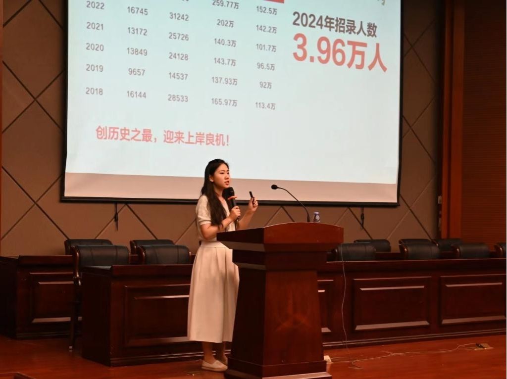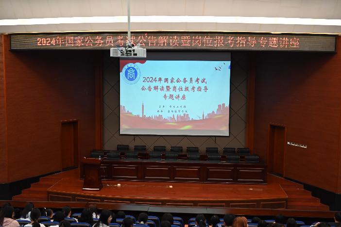 钟媛从公务员考试报考须知、岗位筛选、考试内容及填报指导等四个方面,为同学们详细解读了2024年国家公务员考试的公告,并提出了具体的报考指导意见。她勉励同学们要“敢为天下先,爱拼才会赢”,用拼搏奏出时代的最强音,实现投身工作岗位报效家国之梦想。