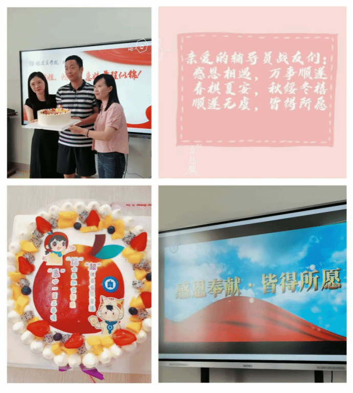 转岗辅导员欢送会上,学院为3位转岗辅导员精心定制了寓意美好的转岗礼物,精心制作他们的工作点滴记录视频。党委书记廖新平介绍了多年来他们对学院的贡献,感谢他们的辛勤付出。学院班子成员和广大教师为他们一一送上祝福,希望他们在新的岗位上虚心学习,争取更大进步。转岗辅导员们表示离开学院感到依依不舍,感谢学院老师们对自己的支持帮助,祝福学院发展越来越好。