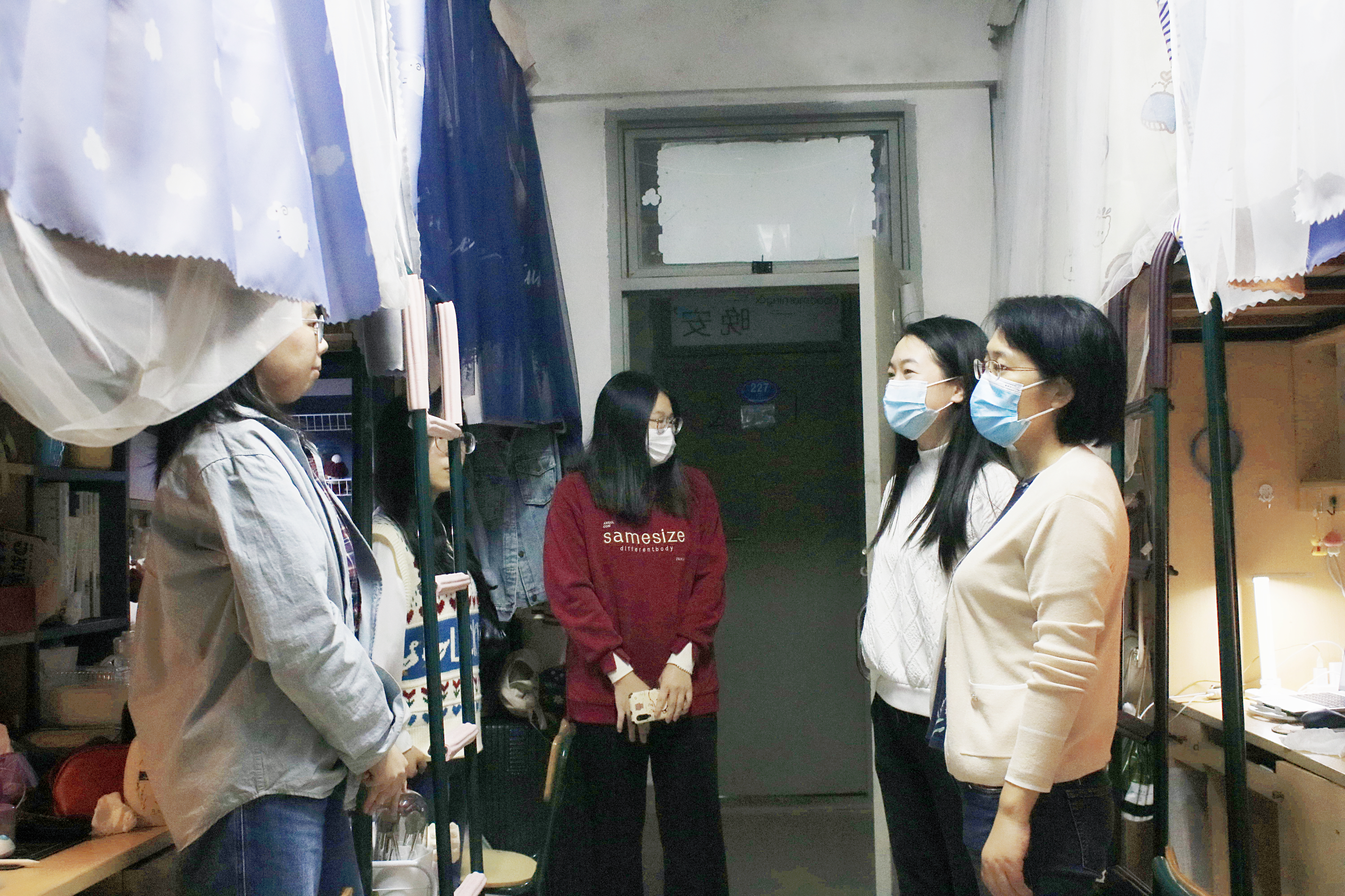 走访过程中,张院长与同学们亲切地交谈,细致询问了同学们隔离期间线上学习、心理健康、身体锻炼、个人规划等方面的情况,并为同学们在疫情期间服从大局、坚持学习、同心抗疫的表现点赞。