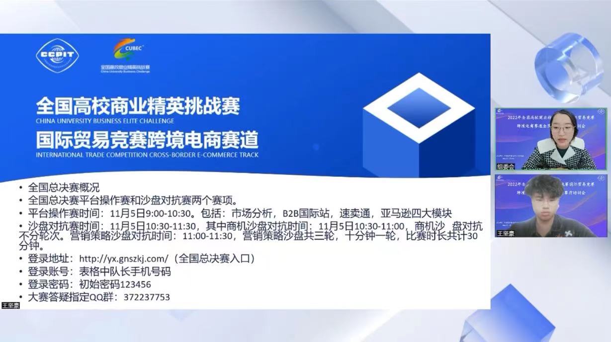 11月5日和7日,由中国国际贸易促进委员会商业行业委员会、中国国际商会商业行业商会和中国商业经济学会主办,各省(自治区、直辖市)高校牵头承办的2022年全国高校商业精英挑战赛国际贸易竞赛跨境电商赛道全国总决赛在线上举办。经过层层选拔,全国总决赛阶段整体规模达687支参赛队伍3000余人同台竞赛。