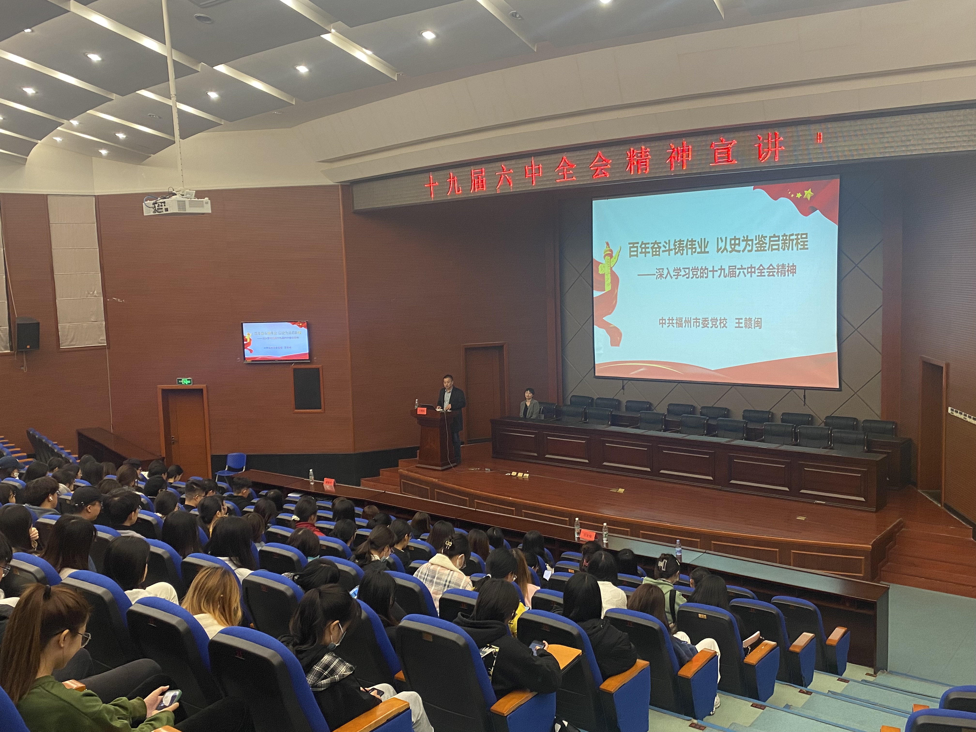 会上,王赣闽以“百年奋斗铸伟业,以史为鉴启新程”为题,紧密围绕《中共中央关于党的百年奋斗重大成就和历史经验的决议》,全面系统地介绍了党的十九届六中全会的重大意义、党的百年奋斗重大成就和历史经验,重点阐释了党的十八大以来原创性思想、变革性实践、突破性进展和标志性成果等内容。报告主题鲜明、思想深刻、内容丰富,有政治高度、理论深度、实践厚度,对广大师生深入学习领会党的十九届六中全会精神具有重要的指导和推动作用。