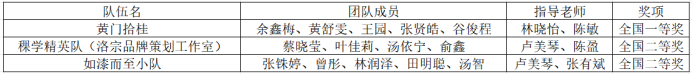 本次比赛竞争激烈,参赛队伍众多,在林晓怡、陈敏、卢美琴、陈盈、张有斌等5位老师的悉心指导下,共有3支队伍经过层层选拔脱颖而出。其中黄门拾桂队荣获全国一等奖;稞学精英队、如漆而至小队2支队伍荣获全国二等奖。